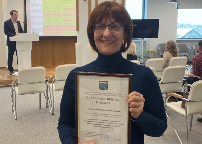 Декан экономического факультета Надежда Космачёва отмечена благодарностью за разработку обучающих программ / 25 ноябряКомитет по развитию малого, среднего бизнеса и потребительского рынка Ленинградской области выразил благодарность декану экономического факультета, доктору экономических наук, профессору Надежде Михайловне Космачёвой за организацию и содействие в реализации программы повышения квалификации сотрудников организаций инфраструктуры поддержки Ленинградской области. |