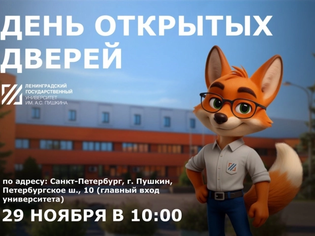 29 ноября 2025 года в 10:00 в главном корпусе ЛГУ им. А.С. Пушкина состоится День открытых дверей. Адрес: Санкт-Петербург, г. Пушкин, Петербургское ш., 10.