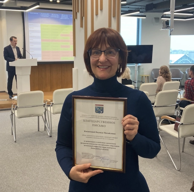 Комитет по развитию малого, среднего бизнеса и потребительского рынка Ленинградской области выразил благодарность декану экономического факультета, доктору экономических наук, профессору Надежде Михайловне Космачёвой за организацию и содействие в реализации программы повышения квалификации сотрудников организаций инфраструктуры поддержки Ленинградской области.