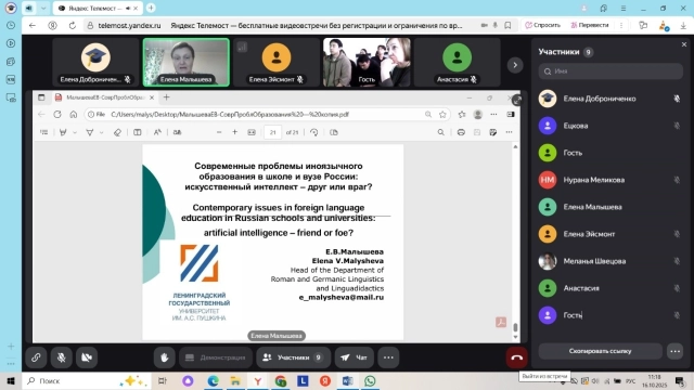 Кандидат филологических наук, доцент, заведующая кафедрой романо-германской филологии и лингводидактики Елена Владимировна Малышева прочитала лекцию «Современные проблемы иноязычного образования в школе и вузе России: искусственный интеллект — друг или враг?» (“Contemporary issues in foreign language education in Russian schools and universities: artificial intelligence – friend or foe?”). В рамках лекции были рассмотрены вопросы дидактического творчества преподавателя иностранных языков в современных условиях, а также вопросы влиянии искусственного интеллекта на этот процесс. Также лектор осветила вопросы выявления культурных стереотипов в английском и русском языке с помощью искусственного интеллекта.