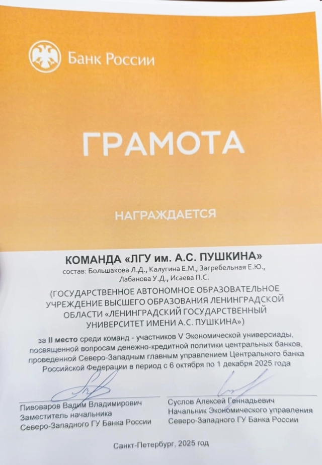 Команда IV курса экономического факультета ЛГУ им. А.С. Пушкина заняла второе место в завершающем этапе V Экономической универсиады Северо-Западного главного управления Центрального Банка Российской Федерации, посвященной вопросам денежно-кредитной политики центральных банков.