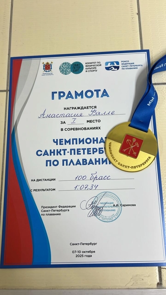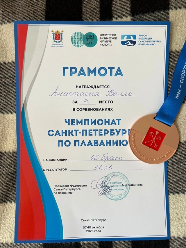 ► студентка II курса Анастасия Валле заняла первое место на дистанции 100 м брассом с результатом 1:07 и третье — на дистанции 50 м брассом с результатом 31,56.