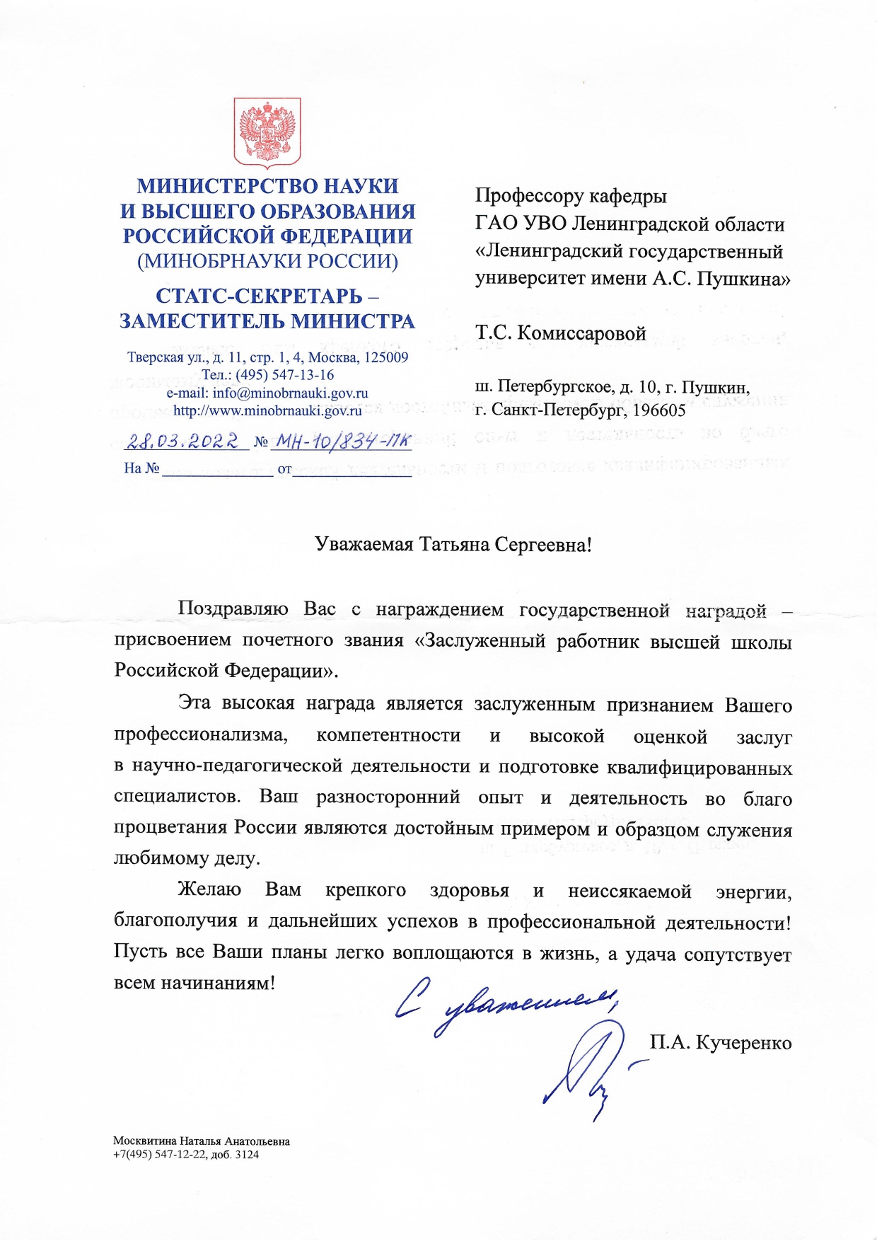 Профессору ЛГУ им. А. С. Пушкина Т. С. Комиссаровой присвоено почетное звание "Заслуженный работник высшей школы Российской Федерации" за заслуги в педагогической деятельности и подготовке квалифицированных специалистов.