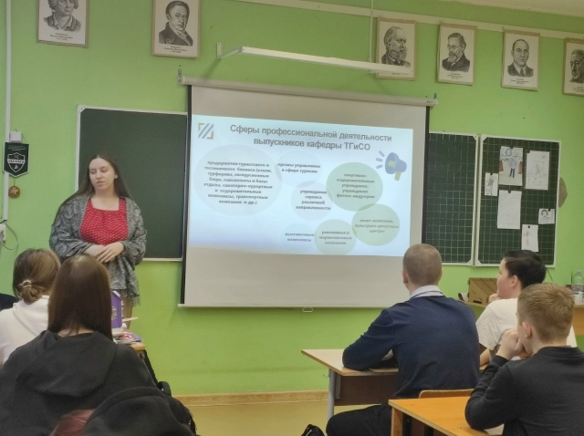 О структуре университета и направлениях подготовки рассказали доцент Наталья Александровна Якубовская и студенты V курса Полина Степанова и Елизавета Филипченко. В рамках мероприятия школьники посмотрели профориентационные видеоролики и приняли участие в увлекательной краеведческой викторине «Ленинградская волшебная тропа». В свою очередь учащиеся обсудили с универсантами особенности поступления в вуз в 2026 году, поделились своими предпочтениями и ожиданиями в выборе будущей профессии. Особенно их заинтересовали направления и условия приема на специальности среднего профессионального образования.
