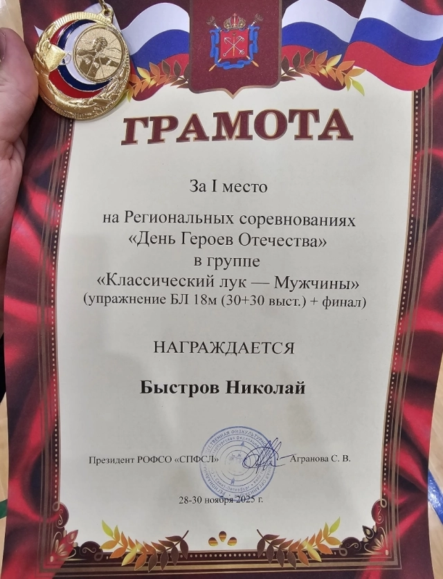 Студент II курса экономического факультета Николай Быстров завоевал золото в группе «Классический лук» среди мужчин (упражнение блочный лук 18 м (30+30 выстр.) + финал) на Региональных соревнованиях по стрельбе из лука «День Героев Отечества».