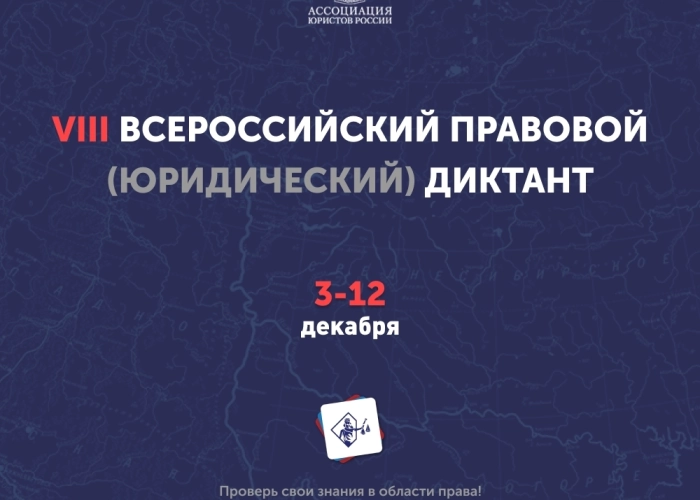 Информация о Всероссийском правовом (юридическом) диктанте / 27 ноябряОбщероссийская общественная организация «Ассоциация юристов России» в период с 3 по 12 декабря 2025 года проводит ежегодный Всероссийский правовой (юридический) диктант, тематика которого касается актуальных правовых вопросов и основ российского права. |