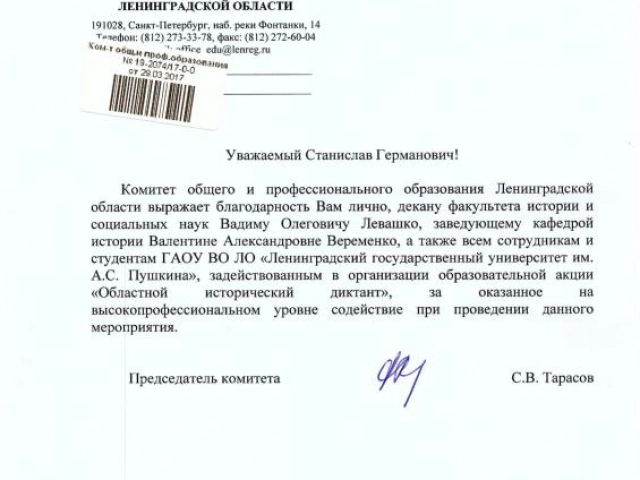 С.В. Тарасов, председатель комитета общего и профессионального образования Ленинградской области, выражает благодарность ректору и коллективу ЛГУ им.А.С.Пушкина за организацию и проведение образовательной акции «Областной исторический диктант».