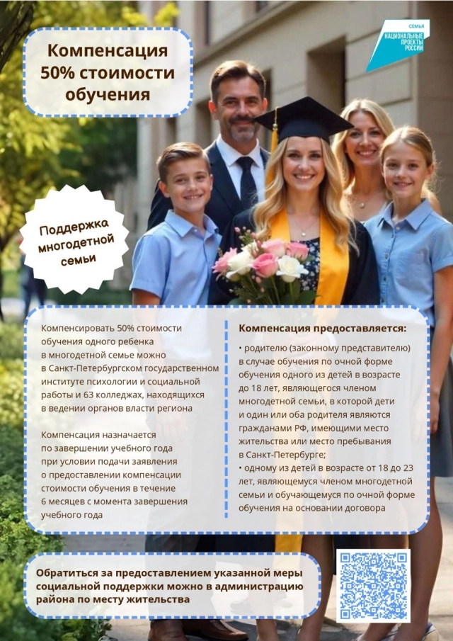 ► компенсация 50% стоимости обучения в профессиональных образовательных организациях и образовательных организациях высшего образования, находящихся в ведении исполнительных органов государственной власти Санкт-Петербурга, одного из детей многодетной семьи;