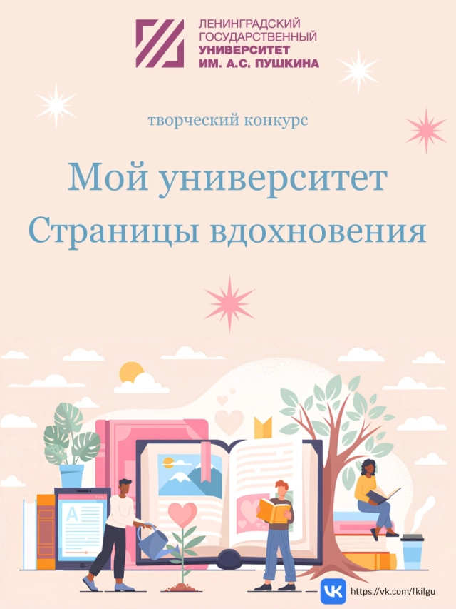 Факультет философии, культурологии и искусства сообщает о начале приёма заявок на ежегодный творческий конкурс для студентов «Мой университет. Страницы вдохновения», приуроченного ко дню основания ЛГУ им. А.С. Пушкина – 29 октября. В этом году объектом конкурса стала университетская библиотека. Сроки проведения: с 15 октября по 15 ноября 2025 года. Результаты конкурса будут опубликованы на сайте университета.