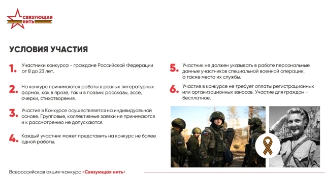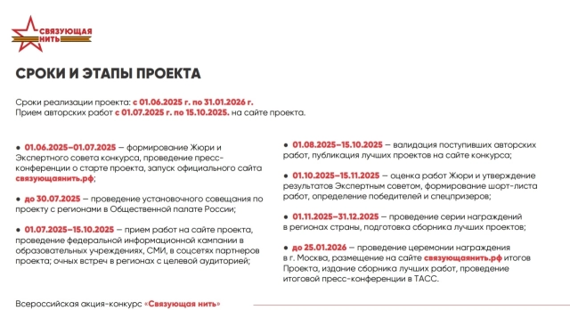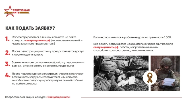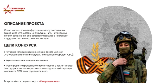Стартовала Всероссийская историко-патриотическая акция-конкурс «Связующая нить», посвященная памяти защитников Отечества. Она направлена на изучение истории семей в контексте Великой Отечественной войны и специальной военной операции (СВО), формирование у детей, подростков и молодежи чувства патриотизма и ответственности за будущее страны.