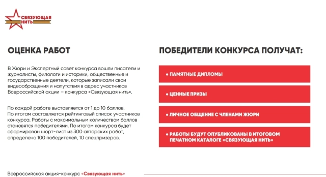 В жюри и экспертный совет конкурса вошли известные деятели культуры, искусства, медиа. Автор проекта — член Общественной палаты РФ, председатель движения «За молодежь» Евгений Мартынов. Победители конкурса получат памятные дипломы, ценные призы, а также их ждет личное общение с членами жюри и экспертного совета. Лучшие работы будут опубликованы в итоговом сборнике «Связующая нить». Церемония награждения пройдет в Москве в конце 2025 года.