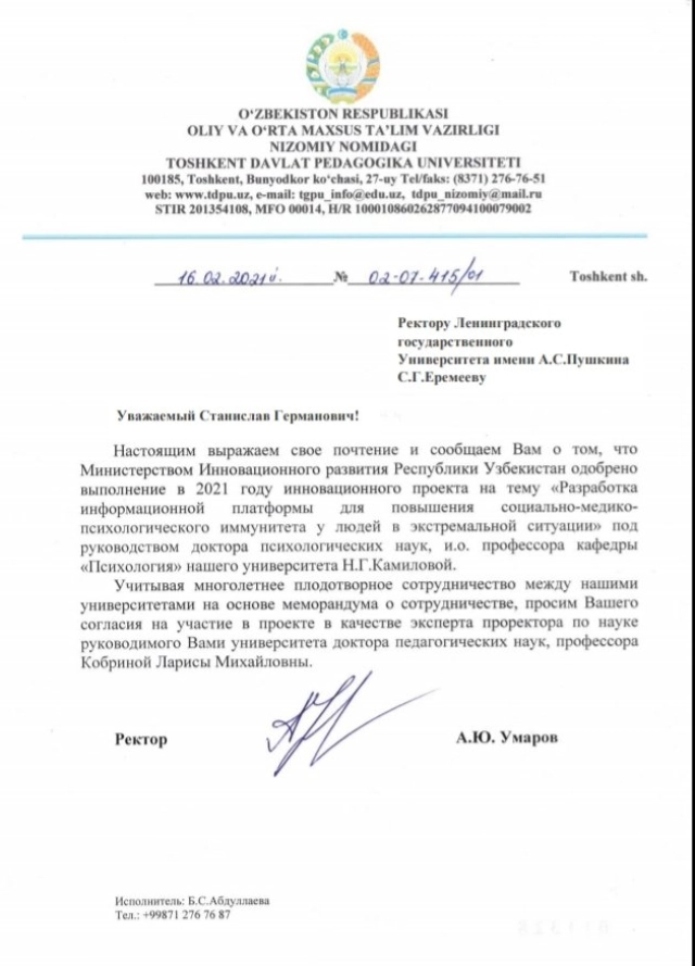 Проректор по научной работе ЛГУ им. А. С. Пушкина получила приглашение от Ташкентского государственного педагогического университета имени Низами.
