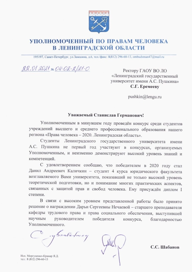Данилу Каличкину, студенту 4 курса юридического факультета ЛГУ им. А.С. Пушкина присужден диплом I степени конкурса «Права человека – 2020. Ленинградская область». Конкурс проводил Аппарат Уполномоченного по правам человека в Ленинградской области Сергея Шабанова. В связи с высоким уровнем представленной работы также был награжден научный руководитель Дарья Ничаева - старший преподаватель кафедры труда и права социального обеспечения.