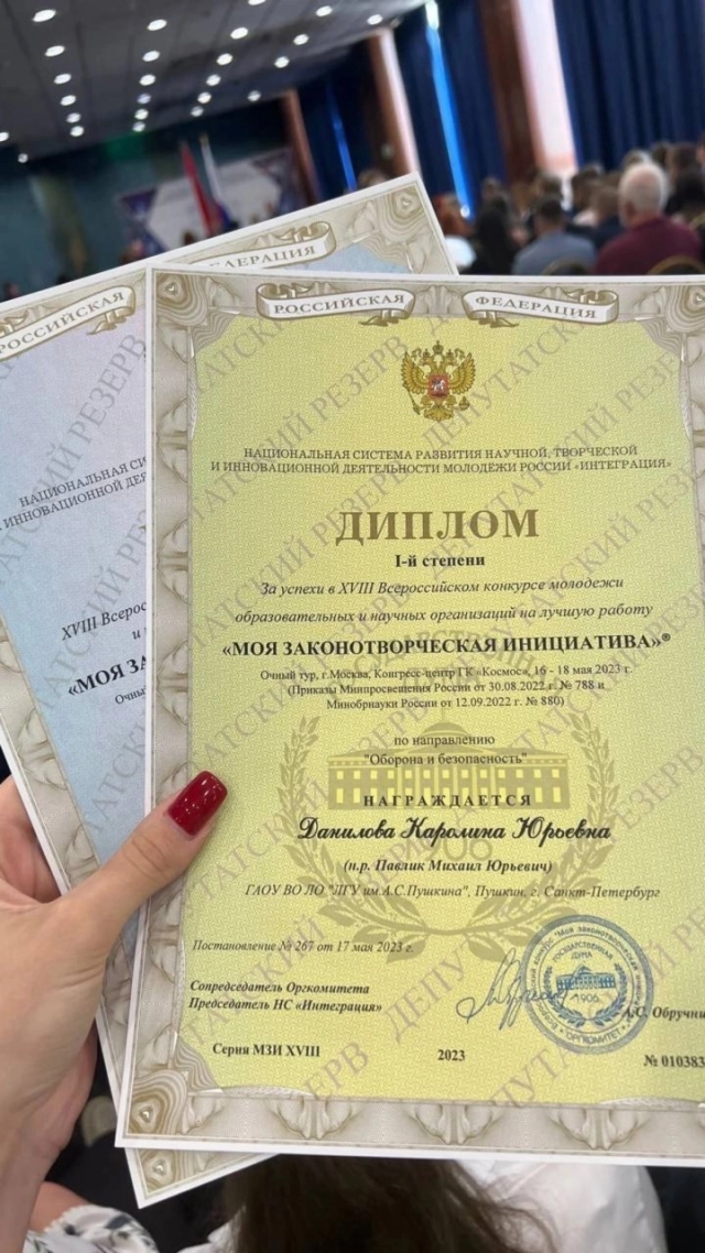 С 17 по 18 мая 2023 г. в московском конгресс-центре «Космос» прошел Всероссийский конкурс молодежи образовательных и научных организаций на лучшую работу «Моя законотворческая инициатива». Среди участников – студенты юридического факультета ЛГУ имени А.С. Пушкина.