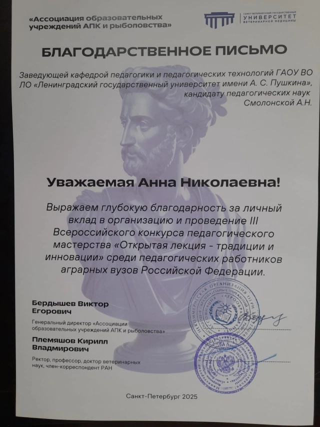 Заведующая кафедрой педагогики и педагогических технологий психологического факультета ЛГУ им. А.С. Пушкина кандидат педагогических наук доцент Анна Николаевна Смолонская приняла участие в работе жюри финала III Всероссийского конкурса педагогического мастерства «Открытая лекция – традиции и инновации», который прошёл 18–19 сентября 2025 года в Санкт-Петербургском государственном университете ветеринарной медицины.