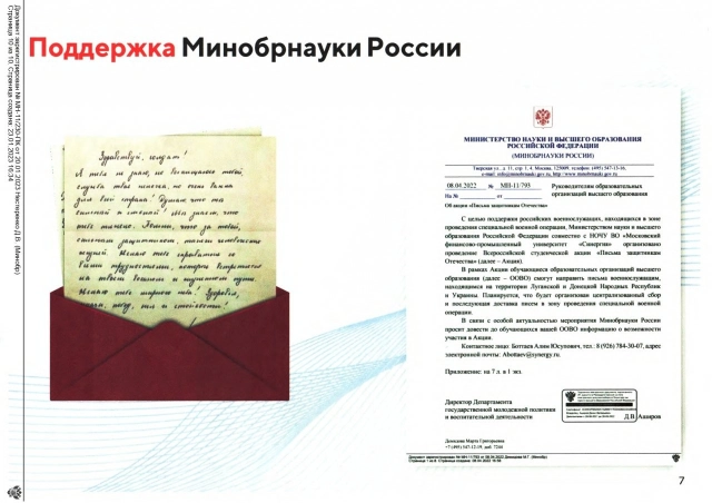 Министерство науки и высшего образования Российской Федерации сообщает о продолжении проведения Всероссийской студенческой акции «Письма защитникам Отечества». Студенты могут направить письма военнослужащим, находящимся на территории Луганской, Донецкой народных республик и Запорожской, Херсонской областей.