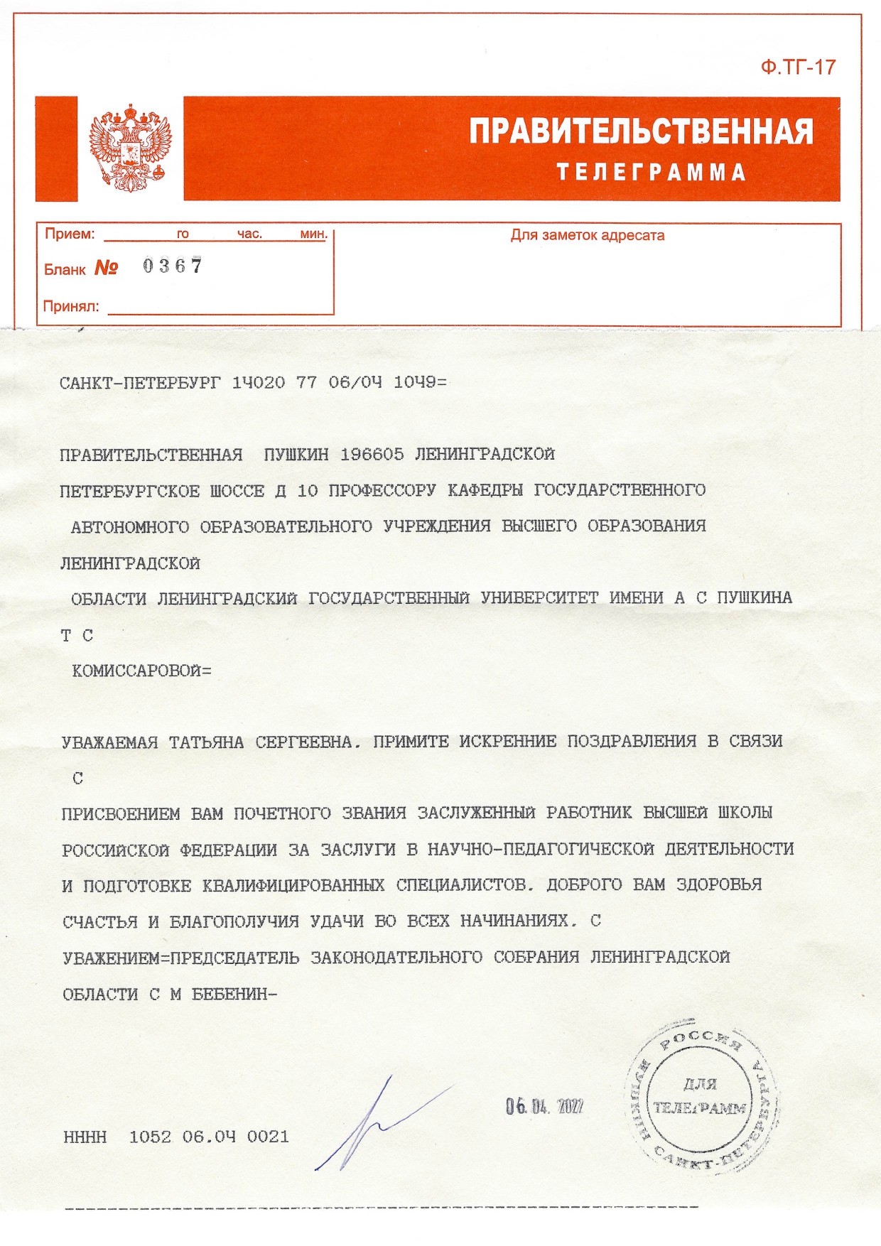 Профессору ЛГУ им. А. С. Пушкина Т. С. Комиссаровой присвоено почетное звание "Заслуженный работник высшей школы Российской Федерации" за заслуги в педагогической деятельности и подготовке квалифицированных специалистов.