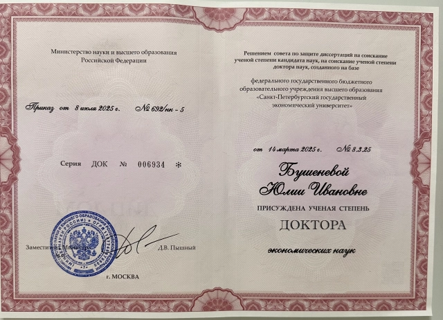 Заведующей Научным отделом ЛГУ им. А.С. Пушкина, доценту Кафедры экономики и управления Экономического факультета Юлии Ивановне Бушенёвой присвоена учёная степень доктора экономических наук. Соответствующий диплом был торжественно вручён ей на заседании Ученого совета университета.