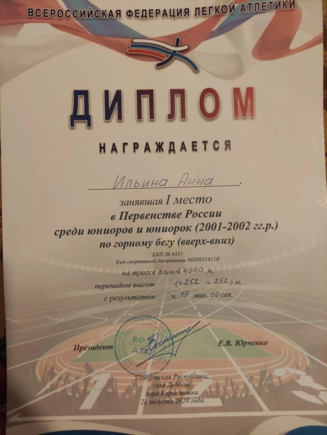 На прошедшем 22 августа 2020 года в Удмурдской республике (город Карасмешка) Первенстве России среди юниоров и юниорок (2001-2002 гг.р) по горному бегу Ильина Анна, мастер спорта, студентка 1 курса факультета физической культуры завоевала ЗОЛОТУЮ МЕДАЛЬ!