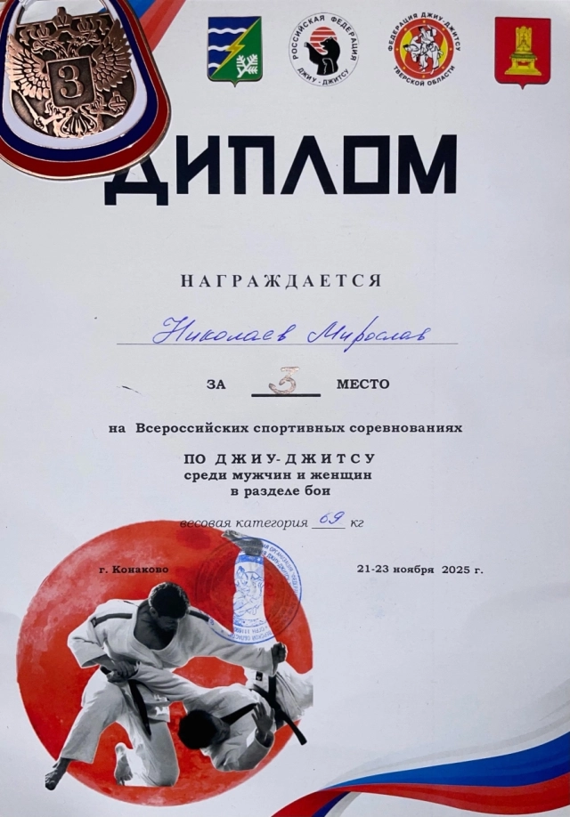 Студент II курса юридического факультета ЛГУ им. А.С. Пушкина Мирослав Николаев завоевал бронзу в разделе «Бои» в весовой категории 69 кг Всероссийских спортивных соревнований по джиу-джитсу среди мужчин и женщин.