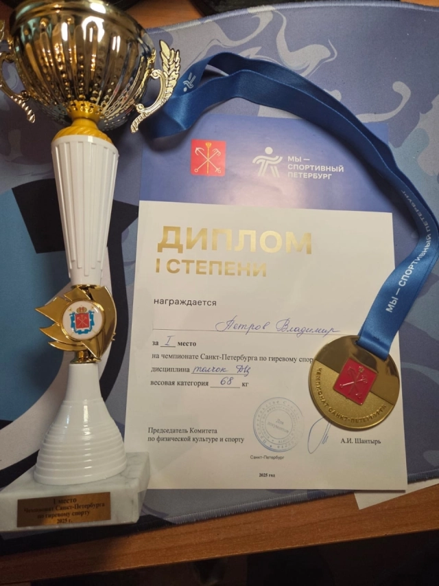 Студент II курса магистратуры факультета физической культуры ЛГУ им. А.С. Пушкина, мастер спорта международного класса Владимир Петров стал чемпионом в дисциплине «Толчок длинным циклом» на Чемпионате Санкт-Петербурга по гиревому спорту, который прошел 22–23 ноября 2025 года на базе физкультурно-оздоровительного комплекса «Газпром».