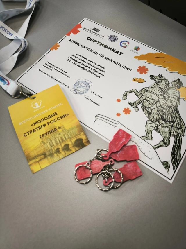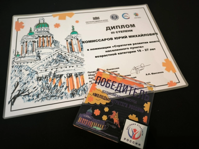 Студент IV курса юридического факультета ЛГУ им. А.С. Пушкина Юрий Комиссаров был награждён дипломом III степени в номинации «Стратегия развития моего населённого пункта» возрастной категории 18–27 лет на очном этапе Всероссийского конкурса «Молодые стратеги России». Юрий представил и успешно защитил свой проект «Зеленые мастерские “Экологичность = практичность”».