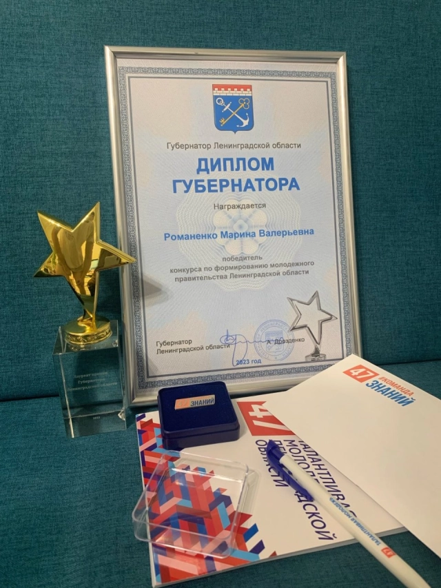 15 декабря в Государственном институте экономики, финансов, права и технологий прошла торжественная церемония награждения талантливой молодежи Ленинградской области по итогам 2023 г. Студентка IV курса факультета естествознания, географии и туризма Марина Романенко стала лауреатом премии Губернатора Ленинградской области в номинации «Социально-значимая и общественная деятельность» как победитель конкурса по формированию молодежного правительства региона.