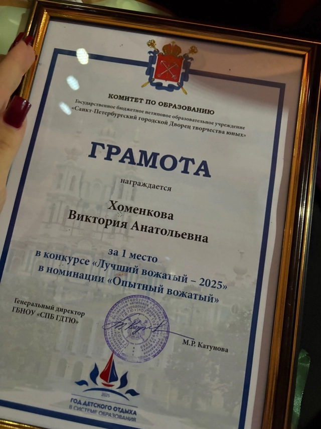 Студентка факультета иностранных языков ЛГУ им. А.С. Пушкина Виктория Хоменкова стала победительницей конкурса «Лучший вожатый — 2025» в номинации «Опытный вожатый» первого городского смотра-конкурса среди лагерей дневного пребывания детей Санкт-Петербурга и Ленинградской области.