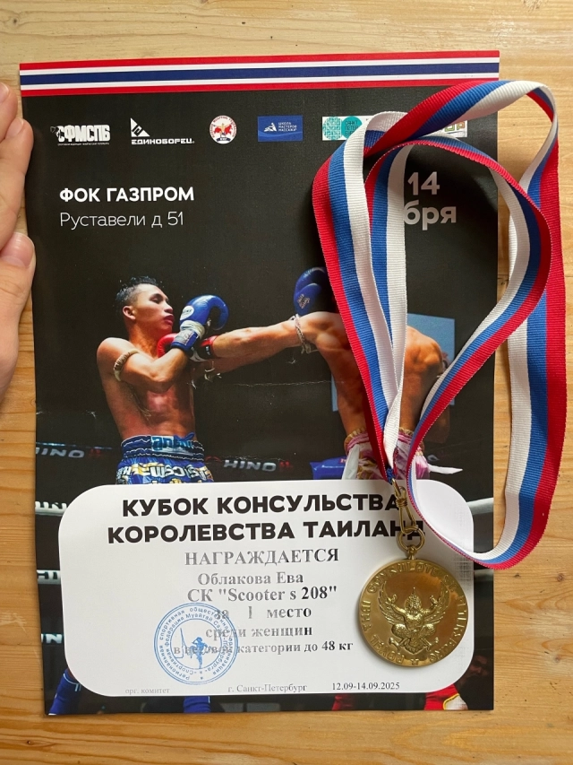 Cтудентка III курса факультета философии, культурологии и искусства ЛГУ им. А.С. Пушкина Ева Облакова заняла первое место среди женщин в весовой категории до 48 кг в соревнованиях по тайскому боксу на Кубок консульства Королевства Таиланд.