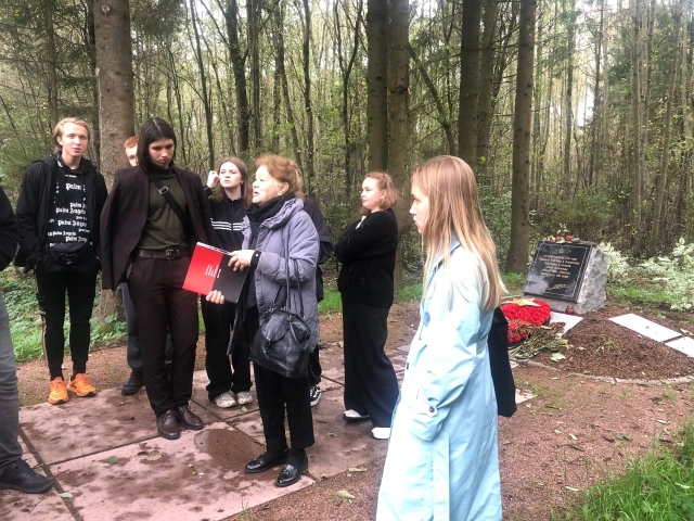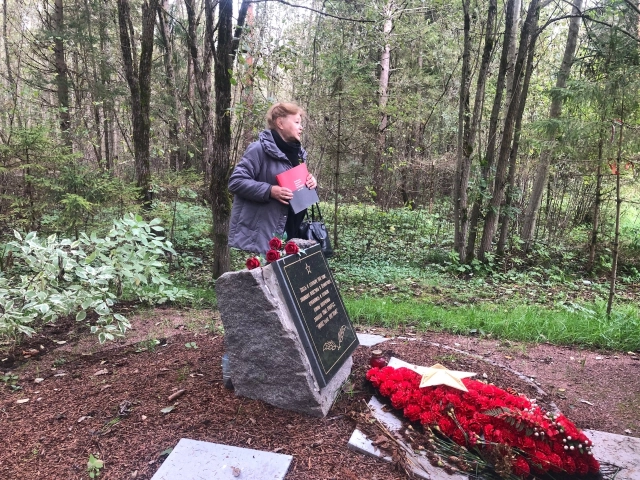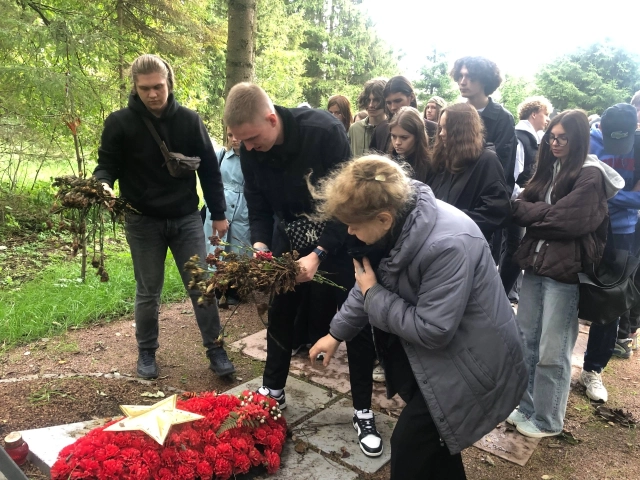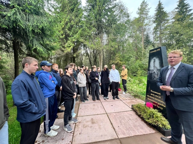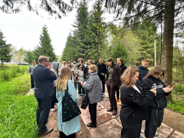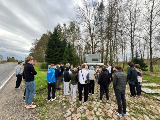 Затем студенты посетили мемориал войнам-ополченцам, установленный на месте оборонительного рубежа Красногвардейского укрепрайона, где сражались ополченцы Балтийского завода и 267 отдельного пулеметно-артиллерийского батальона в августе – сентябре 1941 года недалеко от деревни Пижма.