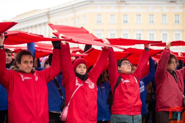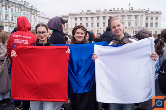 Организаторами акции выступили «Молодая гвардия», «Волонтёрская рота» и «Команда губернатора Санкт-Петербурга». Более 1500 активистов и студентов вузов и ссузов Санкт-Петербурга вышли на Дворцовую площадь и выстроились в три надписи: «Путин», «Россия», «Сила, честь, гордость».
