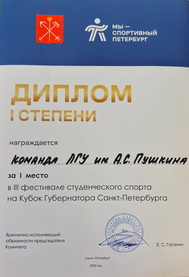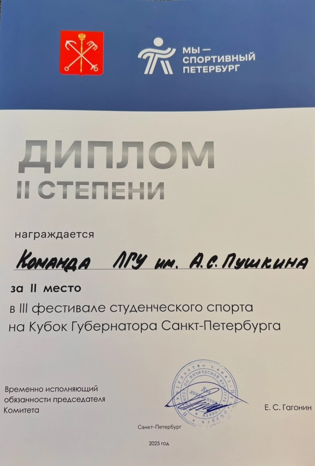 Студенты ЛГУ им. А.С. Пушкина успешно выступили на III Фестивале студенческого спорта «Кубок Губернатора Санкт-Петербурга», которые прошли 25 сентября 2025 года в спортивном комплексе «Стадион «Кировец».