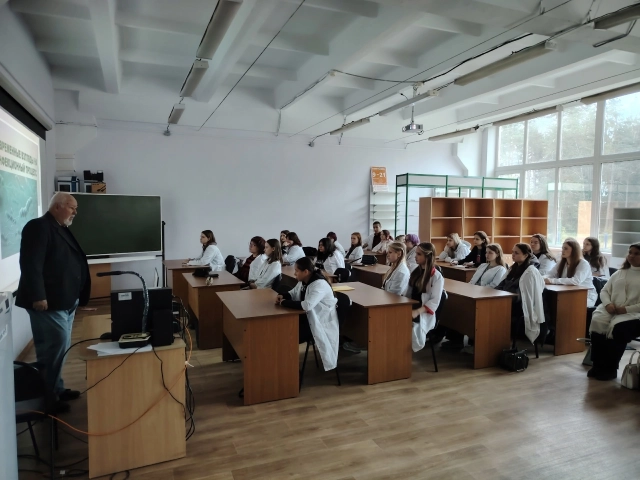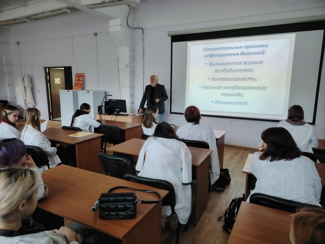 26 сентября доктор медицинских наук, профессор, преподаватель высшей квалификационной категории Виктор Борисович Сбойчаков провел ознакомительную лекцию для студентов-фармацевтов на тему «Современные взгляды на инфекционный процесс», которую прослушали 40 обучающихся колледжа разных курсов. Виктор Борисович познакомил студентов с актуальными представлениями о возбудителе, реакции макроорганизма на внедрение возбудителя и влиянии факторов окружающей среды на развитие процесса, а также с современными методами диагностики инфекционных заболеваний.