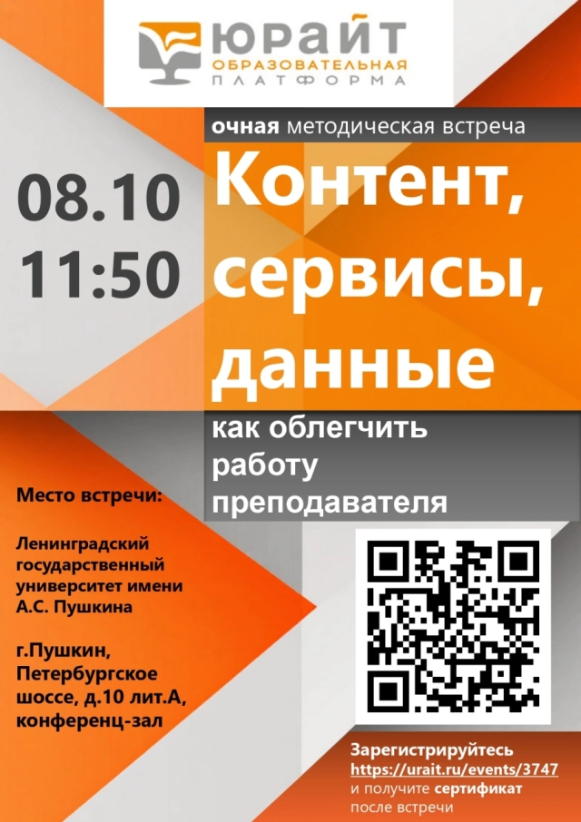 В стенах Ленинградского государственного университета имени А.С. Пушкина 8 октября в 11:50 состоится открытая методическая встреча на тему «Контент, сервисы, данные: как облегчить работу преподавателя» с ведущим куратором Образовательной платформы «Юрайт» Ольгой Подколодней.